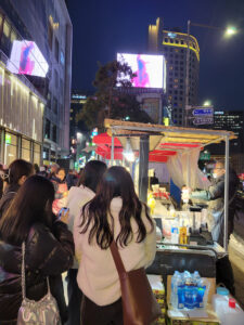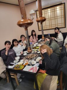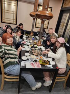 1日目の最後は焼肉「サムギョプサル」でした。本場のサムギョプサルは美味しかった。みんな完食でした。サンチュやおかずが食べ放題だったのもうれしかったです。明洞の夜景を楽しみながら一日を終えました。