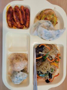 SDGsの一貫としてやっているプラスチック容器を無くす市場で昼食をとりました。プロジェクト加盟店からそれぞれ食べたい料理を持参したお弁当容器に盛り、みんなで一緒に食べました。