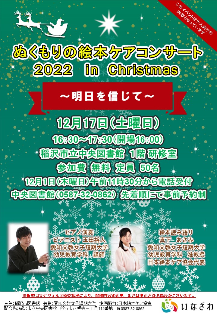 で、大人向けの絵本ケアコンサートを稲沢市中央図書館 研修室で行います。
