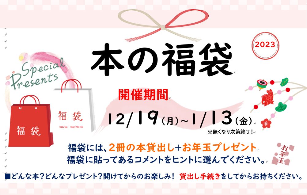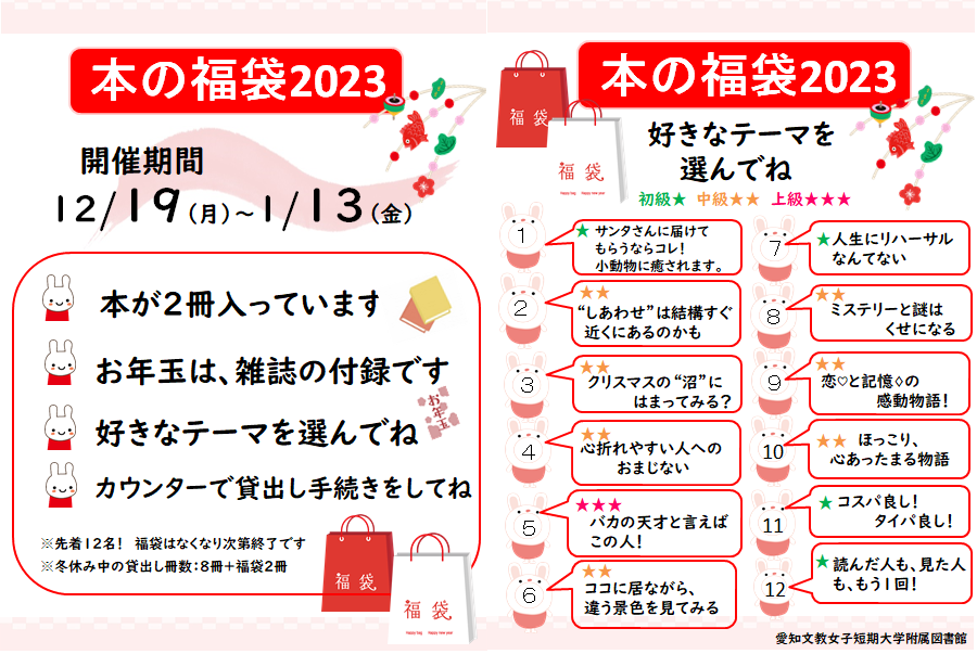 本の福袋2023(附属図書館) 2022.12.21 短大附属図書館では、年末恒例「本の福袋」を開催中です。 袋の中には本が2冊!とお年玉として雑誌の付録!が入っています。 中身は、貸出し後のお楽しみです! 袋に書かれているコメントや難易度レベルの★をヒントに選んでくださいね。 限定12袋となります。