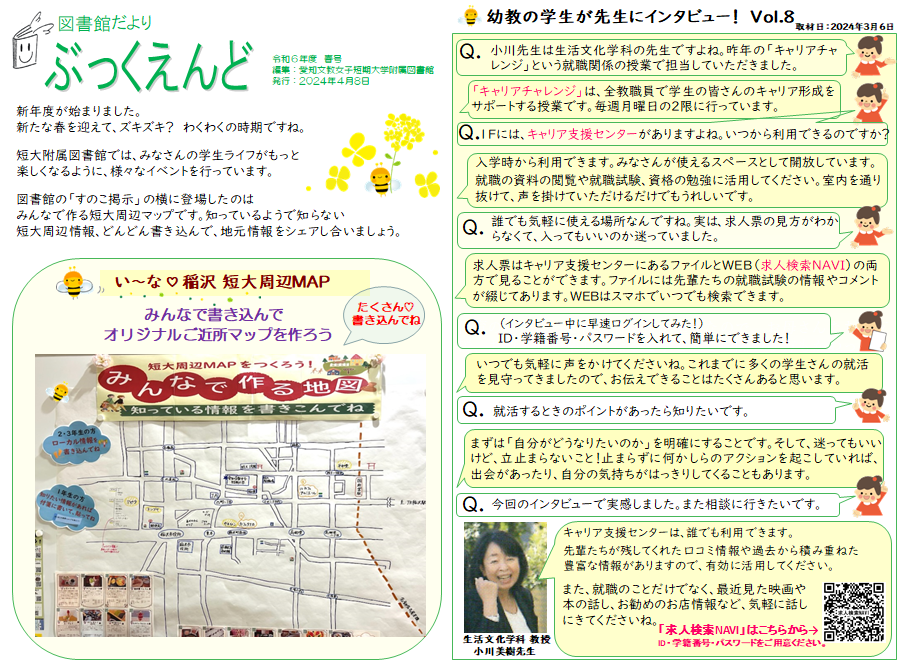 図書館だより 2024年度春号 2024.04.08 図書館だより 2024年度春号では、 幼児教育学科の学生が小川美樹先生(生活文化学科教授)にインタビューした記事を掲載しています。 また、附属図書館のロビーでは、短大周辺のオリジナルご近所マップを公開中です! ローカル情報を書き込んで、みんなでシェアしましょう。