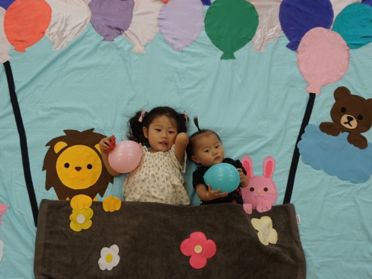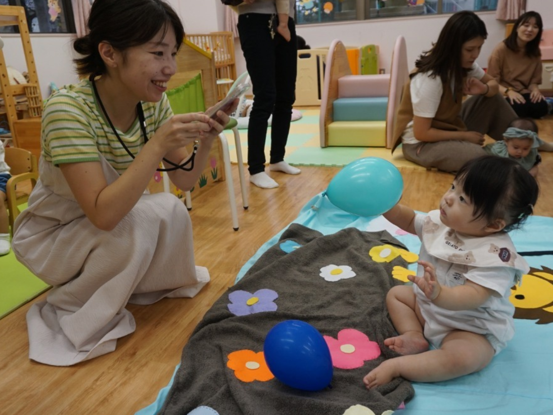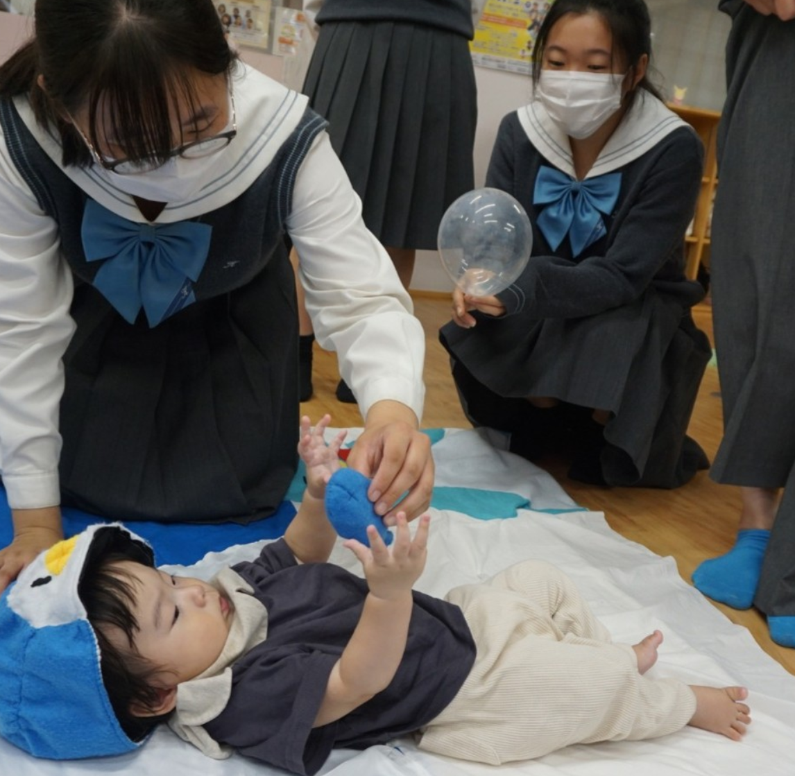子どもたちは、布の手触りを楽しんだり、音の出る素材に興味津々。お母さんたちも、普段とは違う「おひるねアート」のセットの中で、わが子の可愛い瞬間をカメラに収める姿が印象的でした。笑顔あふれる子どもたちの姿に、参加した高校生も保育の楽しさを実感できる貴重な実習の場となりました。