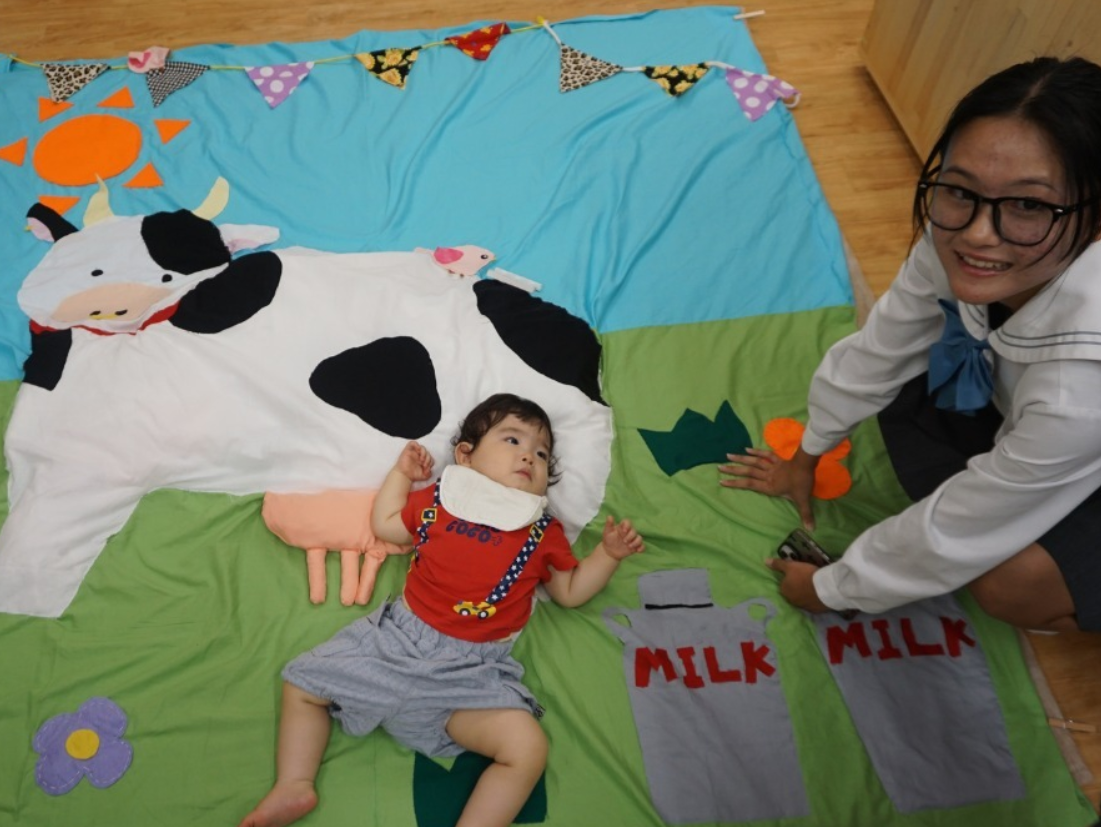 杏和高校の2年生を対象としたこの授業は、幼児教育学科の岩間先生と赤塚先生の指導のもと、6月から企画が始まりました。高校生たちは、子どもたちが喜ぶようなデザインや色使いを考え、動物や海の生き物をテーマにした4つのおひるねアート作品を制作。牧場や海など、子どもたちが想像を膨らませるようなテーマを選び、さまざまな手触りの布や、触るとカシャカシャ音がするビニールを用いた工夫も盛り込まれました。