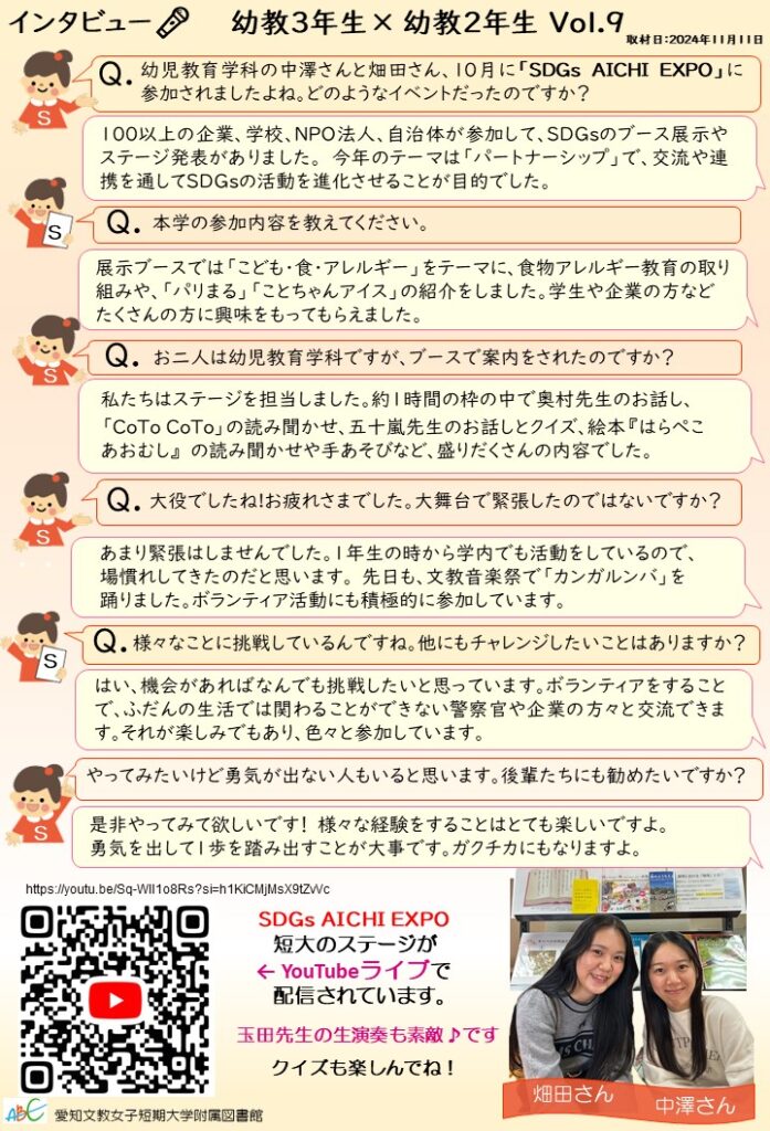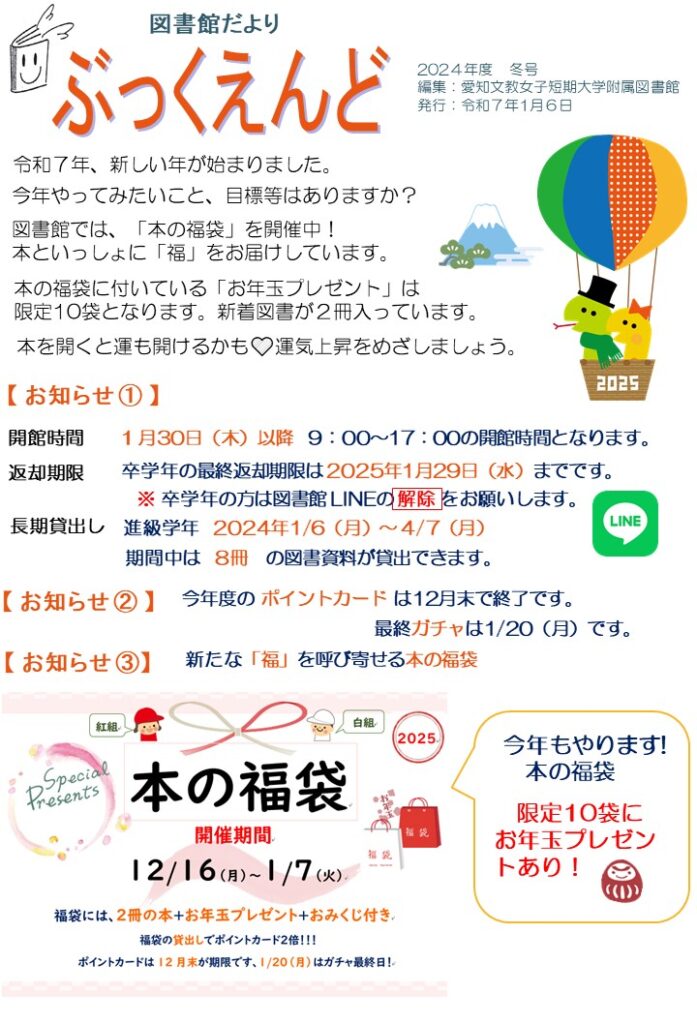 図書館だより 2024年度冬号 2025.01.10 図書館だより2024年度冬号では、学生インタビューが2件あります。 1.「SDGs AICHI EXPO」に参加した幼児教育学科の学生へのインタビュー 2.「みんないっしょのクリスマス」の実行委員、食物栄養専攻の学生へのインタビュー 授業以外でも様々な活動があるため、参加を希望することで経験値が上がりますね。 「図書館だより」では、2025年も学生さんの活動を追いかけてお伝えしていきます。