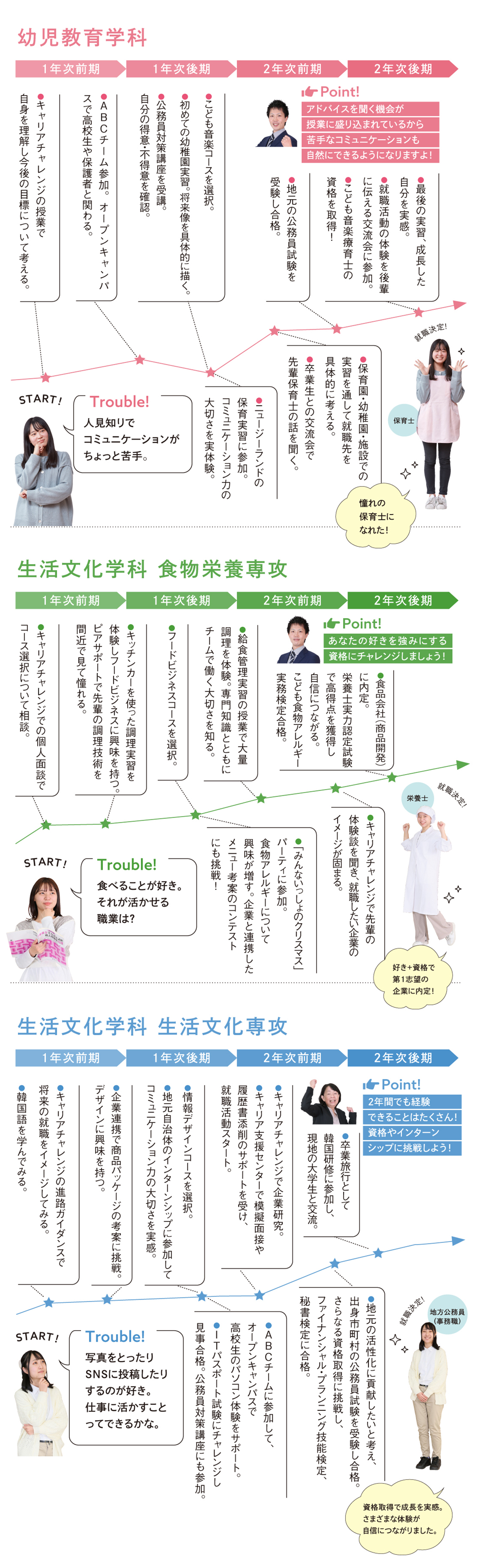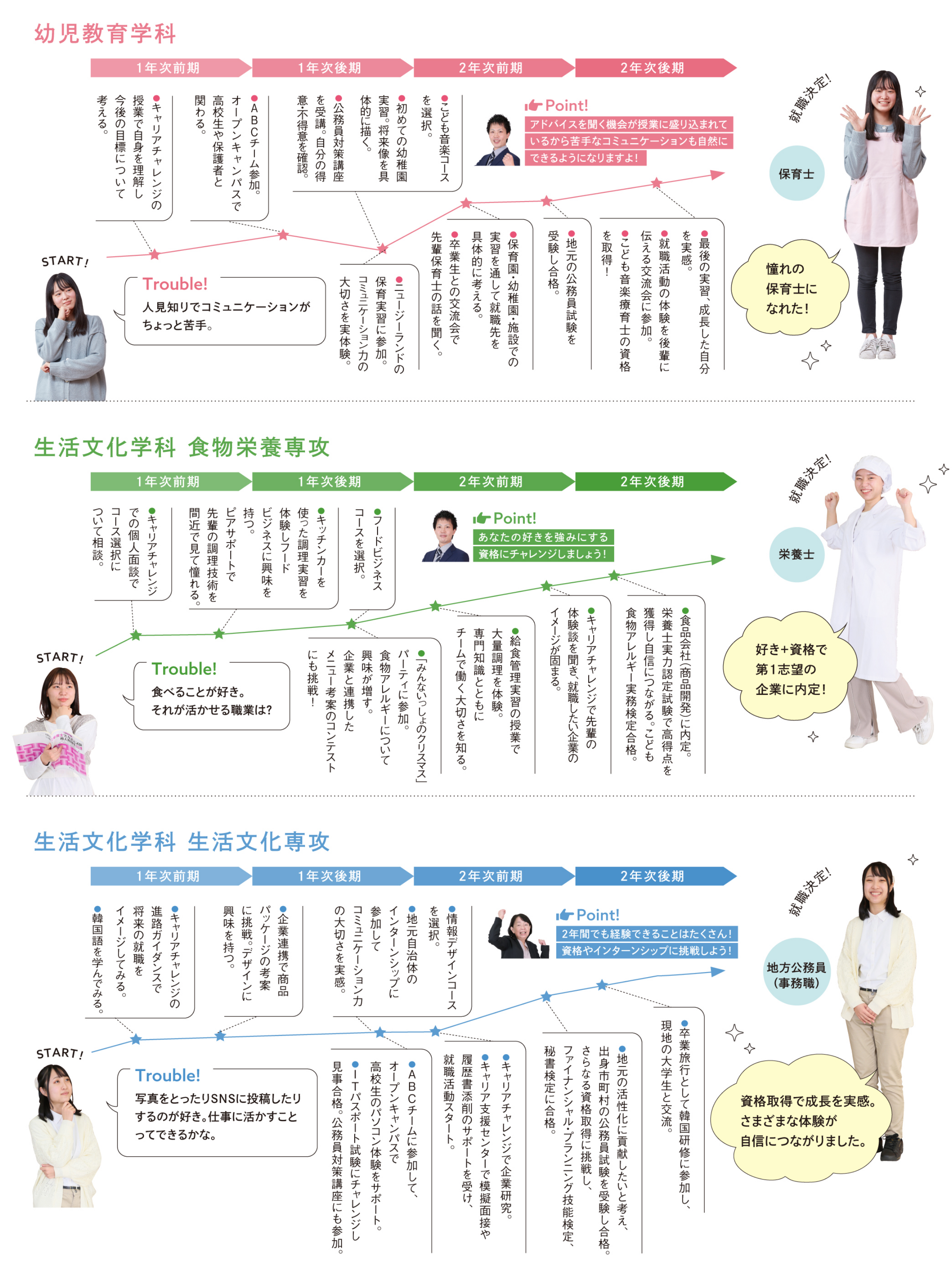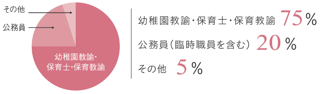 学生全員が公務員対策を受けられる体制が整っており、1年次の9月から卒業年次まで、公務員を目指す学生を対象とした教養科目、専門科目、小論文対策、模擬面接、さらに保育実技対策を行います。さらに希望者は、資格の学校TACによる『公務員講座』を学内で受けられるため、セカンドスクールに通わなくとも、効率よく公務員対策に取り組むことができます