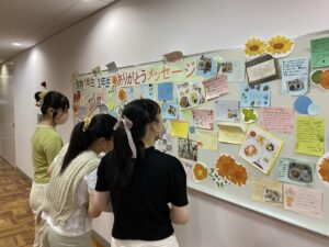 先輩たちに感謝を込めて ーありがとうメッセージー 2022.06.24 食物栄養専攻では2年になると給食管理実習の授業があります。 1年生が、いつも美味しい食事を提供してくれる2年生にメッセージボードを作成しました。 校外実習から戻ってきた2年生は、メッセージを読み喜んでいました。 作成した達成感を味わうことができました。