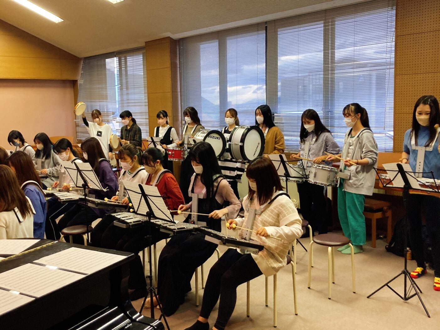 音楽表現の授業風景 2022.10.31 音楽表現の授業の様子をご紹介します。 後期は第1部1年の学生さんがマーチング楽器を体験します。 この日の授業は、実際に園で使われている楽器に触れました。 クラス全員が一つになって子どもの曲を作り上げます。 集中して演奏している様子や学生さんの明るい笑顔が素敵です♪