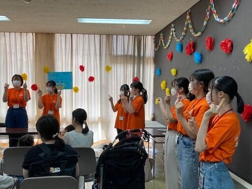 「お姉さんとおはなしを楽しもう!」と題して部屋を飾り付け、 お揃いのオレンジTシャツを着て、いざスタート!