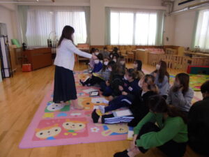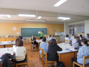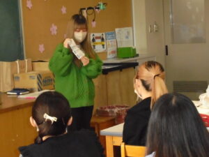 学生が製作したパタパタ絵本を使って、自己紹介をしています。