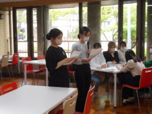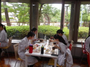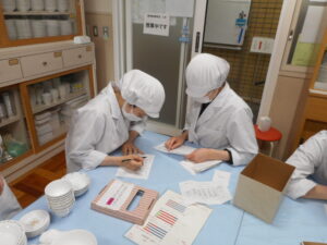 反省会では、リーダー班が司会進行し調理工程ごとに改善点を発表し単なる反省ではなく、今後の提供、さらに給食現場で活かせるように心がけています。