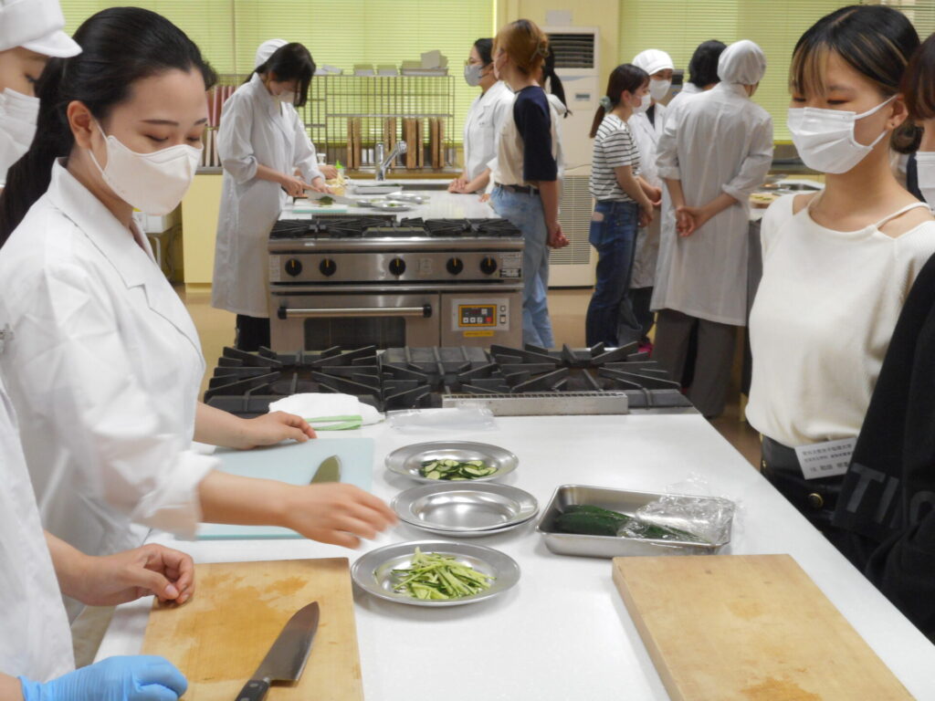 6月26日の食物栄養専攻のキャリアチャレンジは、「調理技術指導」。テーマは「包丁技術」で、2年生が1年生を指導しました。
