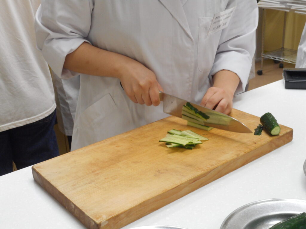 包丁技術の向上によって、大量の食材の下処理を迅速に行うことができます。正しい切り方を学ぶことで、食材のうまみを引き出し調味料の浸透をよくすることができます。また、ケガの防止につながります。