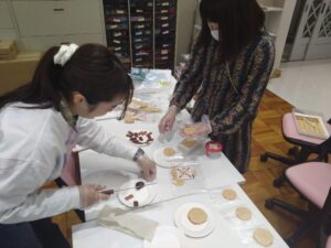 ZOOM会議で、試作品について、授産所安立のスタッフの方と何度も検討を重ね、ポン菓子とチョコを混ぜたものをはさむことに決定。
