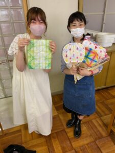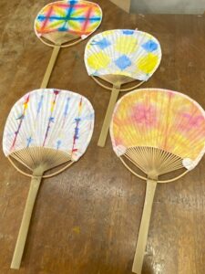 最近の授業では和紙に「折り染め」をして竹うちわを作成中。優しい風を送ってくれる竹うちわ、季節も一緒に楽しんでいます。