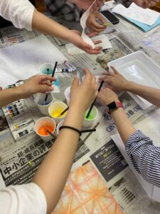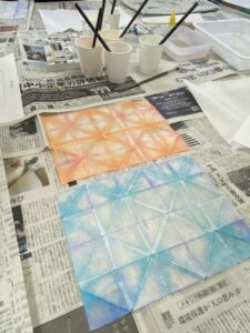 最近の授業では和紙に「折り染め」をして竹うちわを作成中。優しい風を送ってくれる竹うちわ、季節も一緒に楽しんでいます。