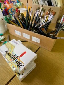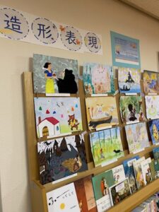 マーブリングやドリッピング等の技法を学び、童話の世界を表現しました。今は、図書館ロビーに展示している作品は、グリム童話をテーマにした作品。いろんな技法で描かれた絵本の世界で、想像の翼はどんどん広がりそうです。