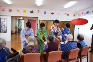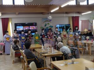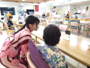 施設のみなさまは突然の学生さんのかわいらしい浴衣姿に驚きながらも、若い方から元気をいただいたとの嬉しいお声をいただきました。ケアハウスでは、100歳を超えるご長寿の皆さまと触れ合い、私たちの方が元気をいただきました。