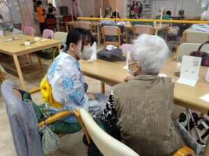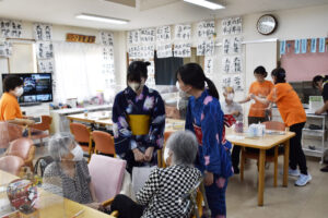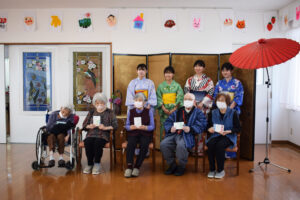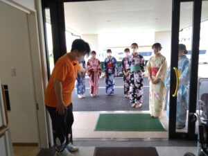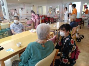 施設のみなさまは突然の学生さんのかわいらしい浴衣姿に驚きながらも、若い方から元気をいただいたとの嬉しいお声をいただきました。ケアハウスでは、100歳を超えるご長寿の皆さまと触れ合い、私たちの方が元気をいただきました。