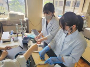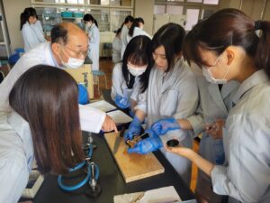 食品衛生学実験では、鮮魚貝類が原因でおこる食中毒について実験をします。この実験によって、食中毒細菌が多く潜んでいる部位や器官が分かります。海中には海水を好む食中毒細菌がいます。海水の温度が上がれば上がるほどその細菌は大量に増殖します。その細菌は真水に弱いという特徴があるので、調理する前は水洗いします。またしっかり加熱することがポイントです。