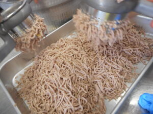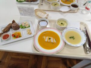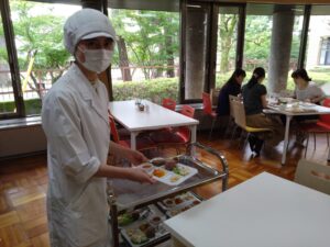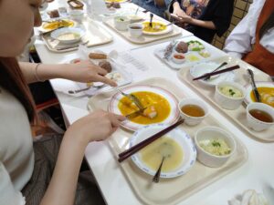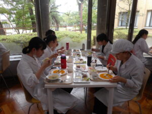 今回は、前菜をワゴン提供しました。1年生は、料理が運ばれてくると写真を撮り、友達同士で「食物アレルギー対応に見えないね」と会話をしながら2年生の調理技術に目を丸くしていました。
