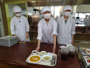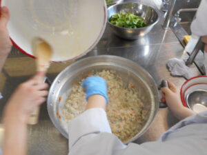 給食管理実習Ⅰの授業も終盤を迎え、7月14日は病態対応食の提供日。病態対応食は、本学の学びを活かした食物アレルギー対応食を提供しています。提供する料理は前年度の「みんないっしょのクリスマス」の料理です。先輩たちがパーティーで提供した料理を実際に調理することで、自分たちが開催するパーティーのイメージを膨らませていきます。