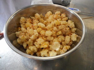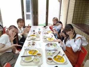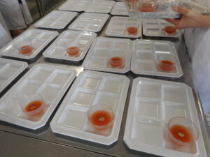 給食管理実習Ⅰの授業も終盤を迎え、7月14日は病態対応食の提供日。病態対応食は、本学の学びを活かした食物アレルギー対応食を提供しています。提供する料理は前年度の「みんないっしょのクリスマス」の料理です。先輩たちがパーティーで提供した料理を実際に調理することで、自分たちが開催するパーティーのイメージを膨らませていきます。