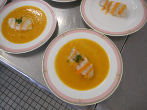 前菜のおさつスターの衣は米粉としんびき粉です。小麦粉を使わなくてもカリッと揚がります。トマトのゼリーは、トマトに見えるように盛り付けました。魚料理のソースはかぼちゃをたっぷり使用し、甘めに仕上げました。