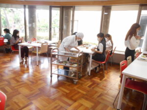 今回は、前菜をワゴン提供しました。1年生は、料理が運ばれてくると写真を撮り、友達同士で「食物アレルギー対応に見えないね」と会話をしながら2年生の調理技術に目を丸くしていました。