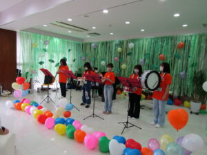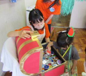 ラウンジでは、ピアノや楽器の生演奏。各教室では、お面や双眼鏡を作ったり、ボール投げや魚釣りを楽しんだり、大きな紙にお絵描きをしたり…宝箱に入ったキラキラのメダルをゲットした子どもたちはとても嬉しそうでした。体育館では、乗り物でコースを走るコーナーもあり、とても盛り上がっていました。