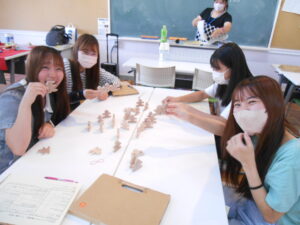 学内で毎年、「おもちゃインストラクター養成講座」を開講しています。この講座は、子どもの成長に合ったおもちゃの選び方や、身近な素材を使ったおもちゃ作りを体験的に学び、子どもと遊びの専門家を目指すことを目的としています。