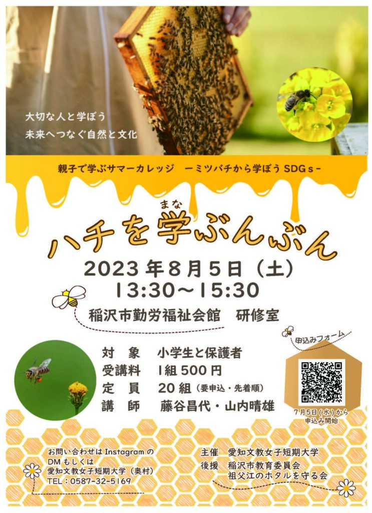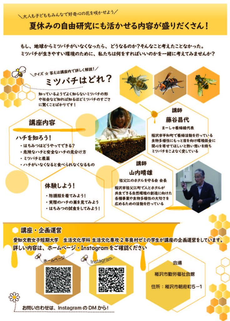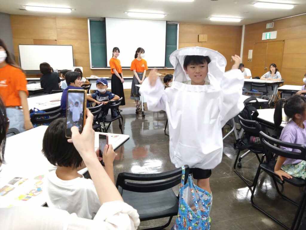 8月5日にミツバチの大切さを学ぶ、サマーカレッジ親子講座を生活文化専攻2年生の卒業研究の奥村ゼミの学生が行いました。