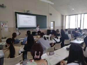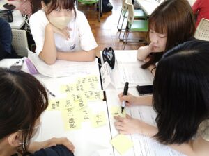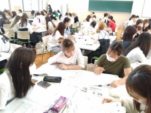 授業の最後には、学科・専攻をミックスした少人数グループで学んだ内容をふりかえり、「一生涯生きがいのある幸せな生活を送るために必要なこと」をグループで考えをまとめ、プレゼンテーションを行います。