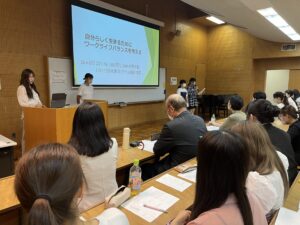 今年の最優秀チームは、「自分らしく生きるためにワークライフバランスを考える」をテーマに発表したチーム「生チーオムトマト」の皆さんでした。誹謗中傷について発表したチームや、多様性、情報リテラシーについて考えたチームなど、現代教養基礎で取り上げた内容をテーマにデータや劇で具体的な例を示したり、聴講している学生にクイズや質問を投げかけたりと、どのグループも「伝える発表」をしっかり行っていました。