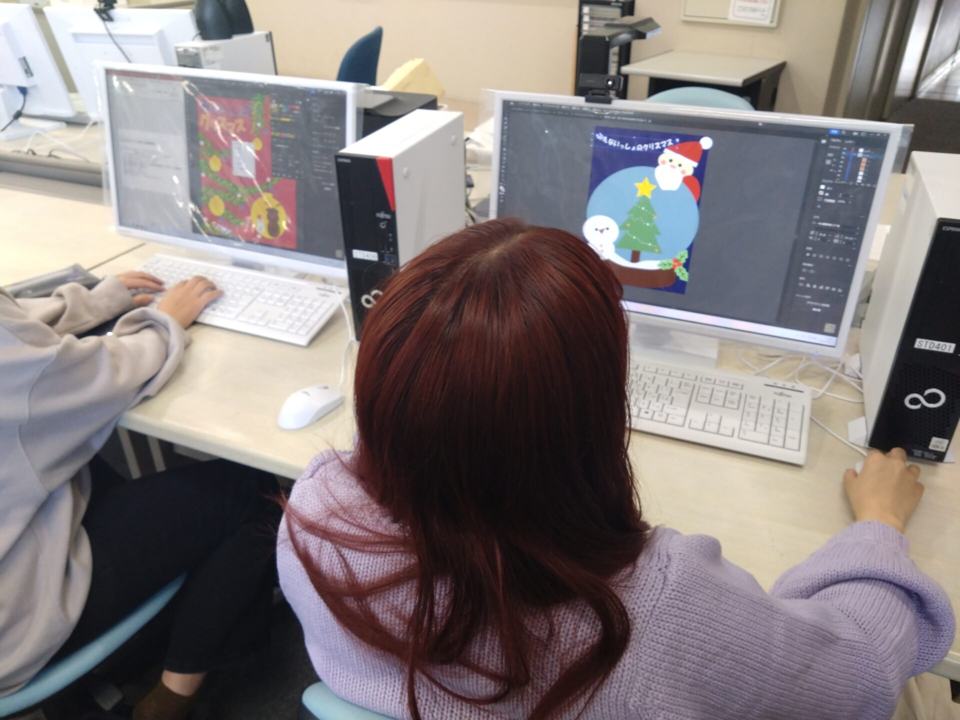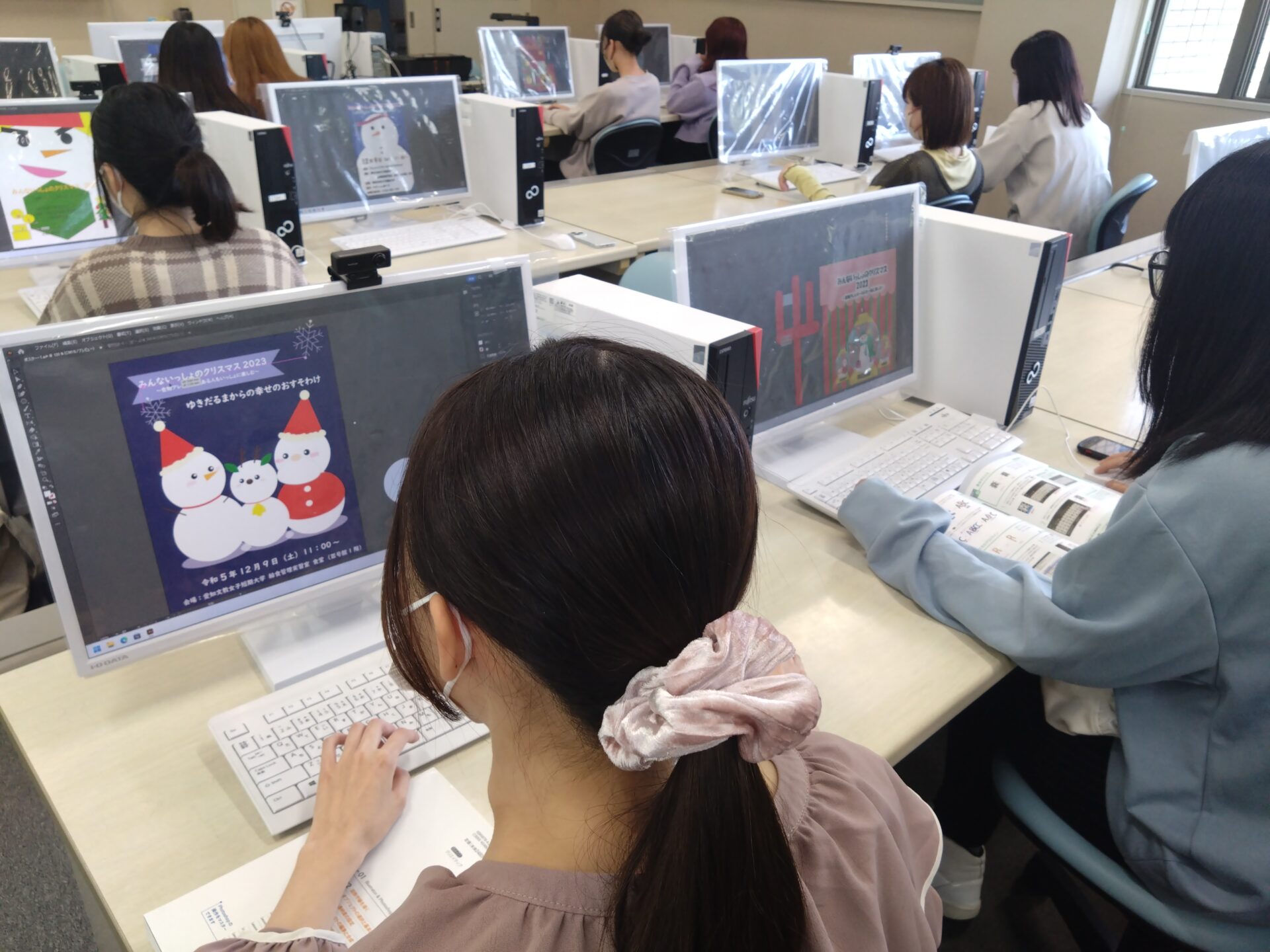 生活文化専攻の学生たちは、ポスターの制作や、当日使用するランチョンマット、ツリーに飾ってプレゼントにするポストカードなどの制作を行っています。CG演習の授業で、イラストレータのソフトを使ってデータを作成しています。