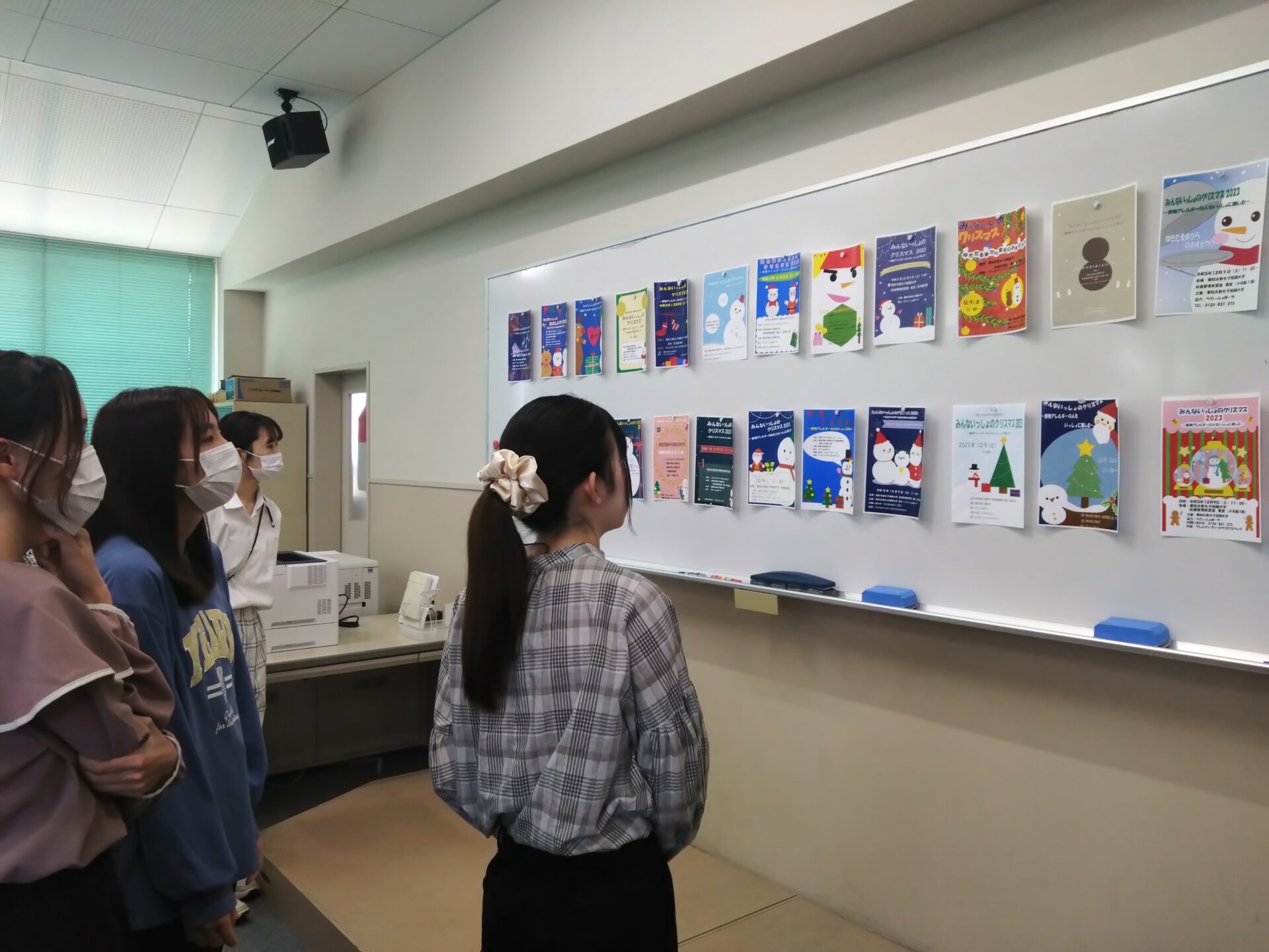 出来上がったデザインをクラスで内検討会を行います。セレクトしたデザインは、食物栄養専攻の学生と教員が投票をして採用が決定。