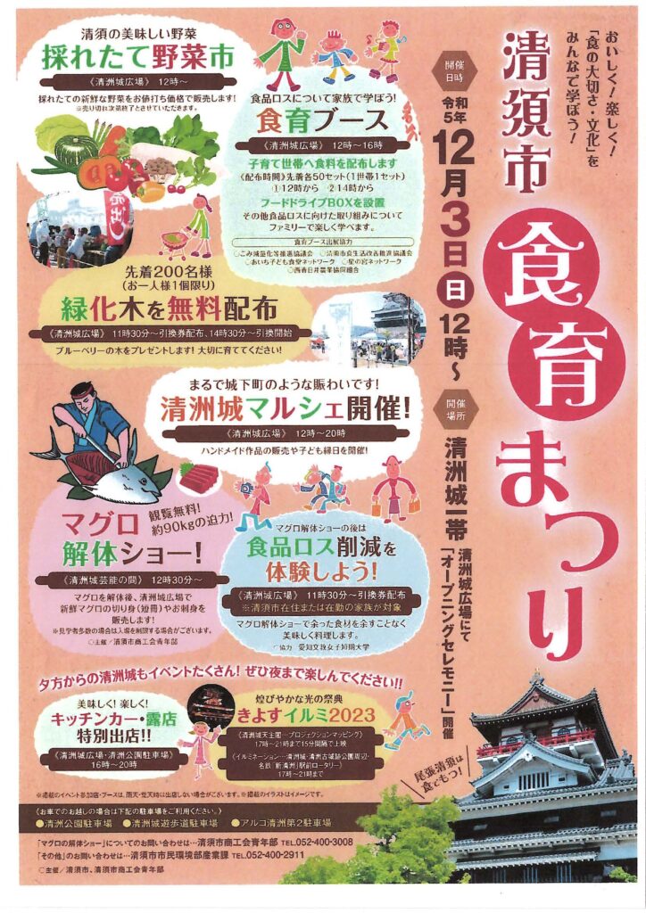 講座の講師を担当した有尾先生のゼミは、12月3日に清須城一帯で行われる「清須市 食育まつり」で、地域の方々に向けて食育体験イベントを行います。マグロの解体ショーで余った食材を余すことなくおいしく料理。食品ロス削減を体験しながらおなかもいっぱいになります。イベントでは、とれたれ野菜市や食育ブース、ブルーベリーの配布など食の大切さ、文化を学ぶことも出来ます。学生たちもオレンジのウィンドブレーカーを着て活動します。ぜひお越しください。