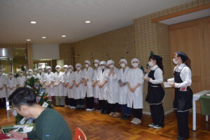 「みんなおいしい」とインタビューに答えてくれました。早朝から腕を振るった調理班もホールへ出てご挨拶。