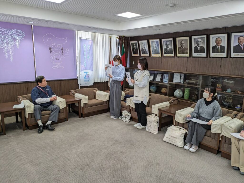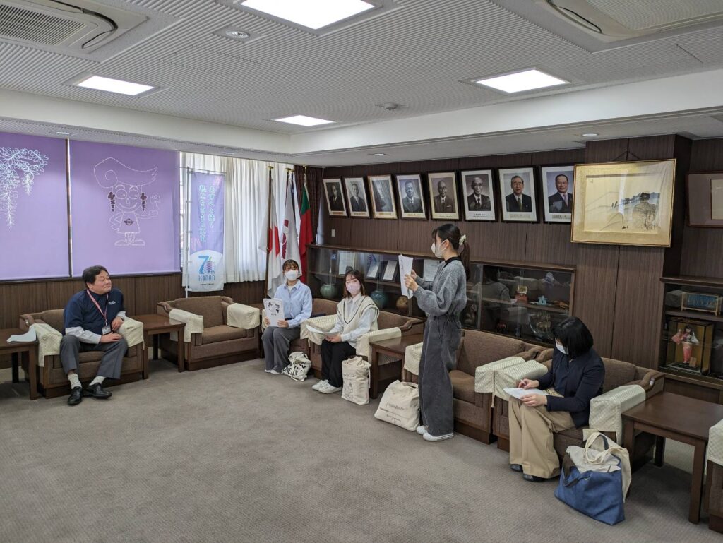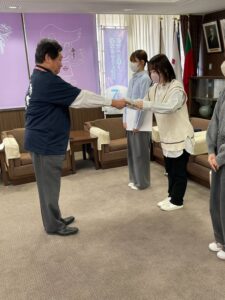 市長公室で、市長にデザインコンセプトや苦労したこと、江南市の印象などを報告し、感謝状をいただきました。