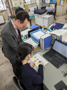 3月27日、デザインした生活文化専攻2年生の学生たちと、江南市長にデザイン制作の報告のため、江南市役所に訪れると、市役所の職員の方が、色とりどりのオリジナルポロシャツを着てお出迎えしていただき、緊張していた学生たちでしたが、自分たちのデザインしたものが実際に形になり、笑みがこぼれていました。