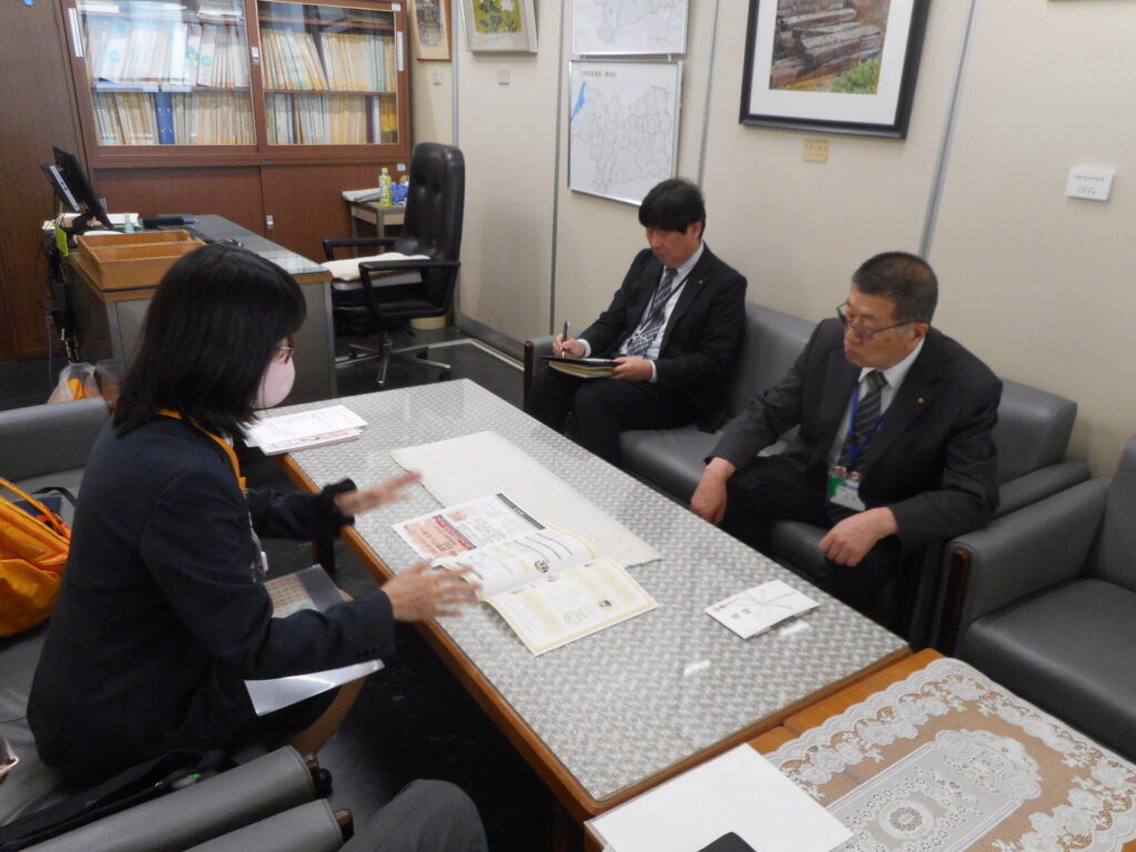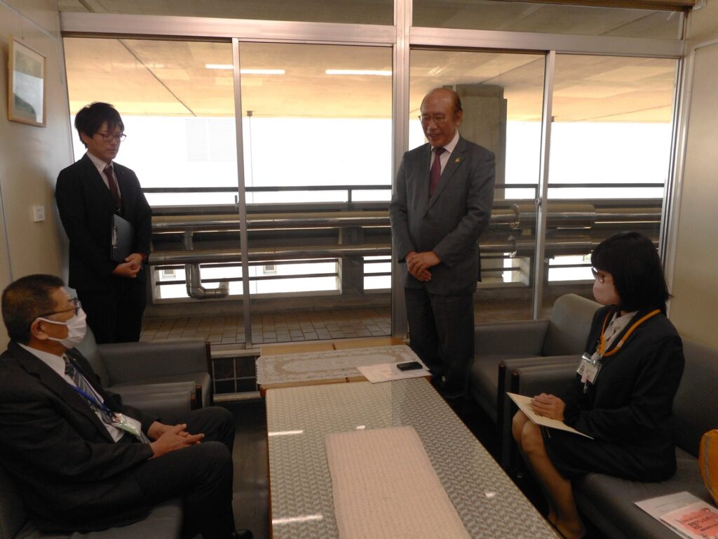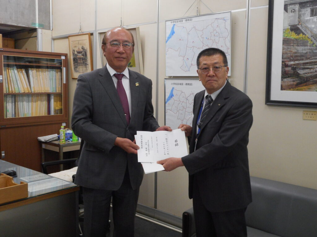 4月15日、稲沢市教育委員会教育長室にて、子ども用防災リュックの贈呈式が行われました。