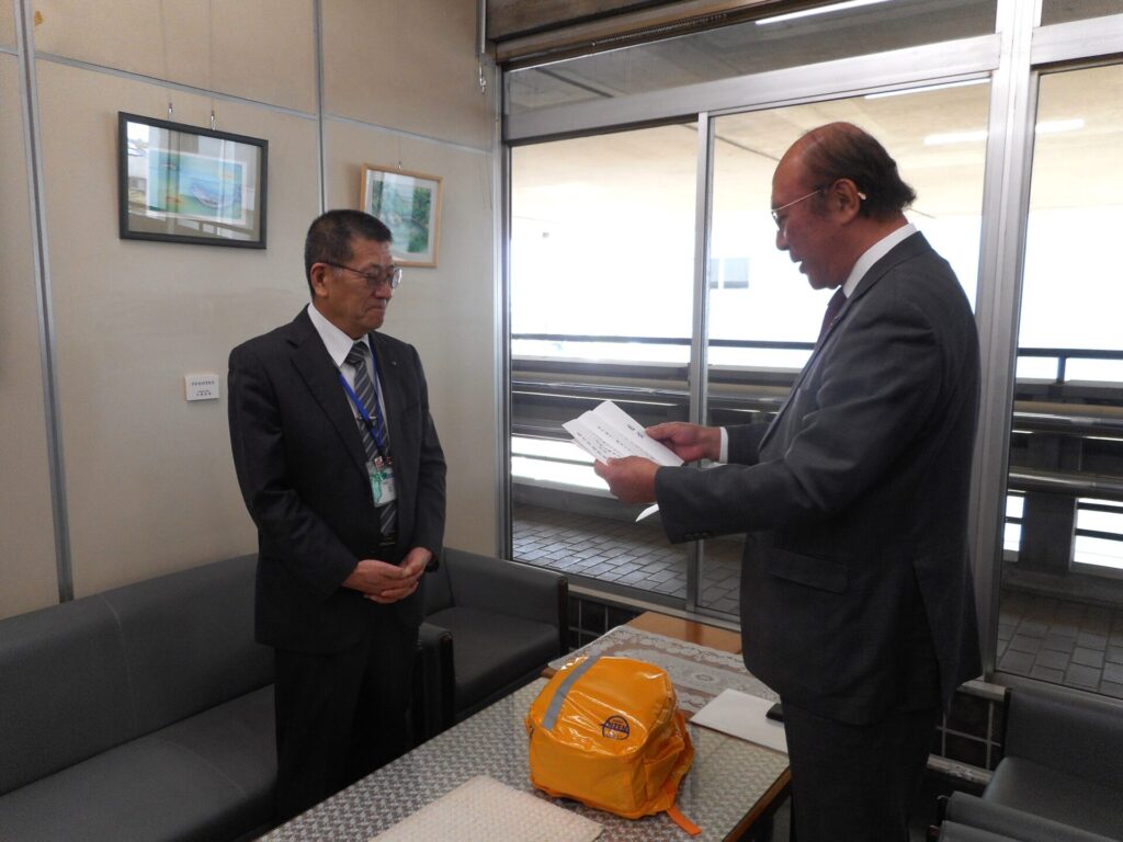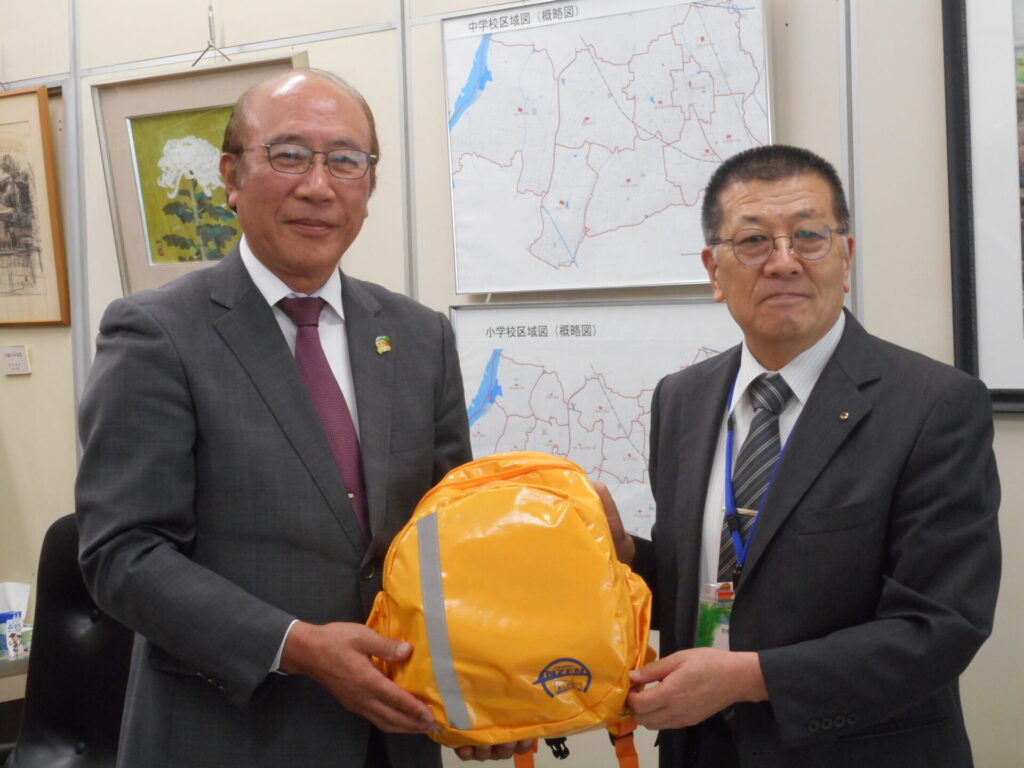 4月15日、稲沢市教育委員会教育長室にて、子ども用防災リュックの贈呈式が行われました。
