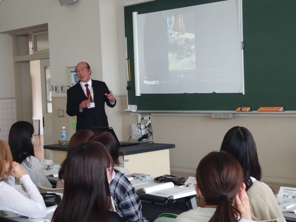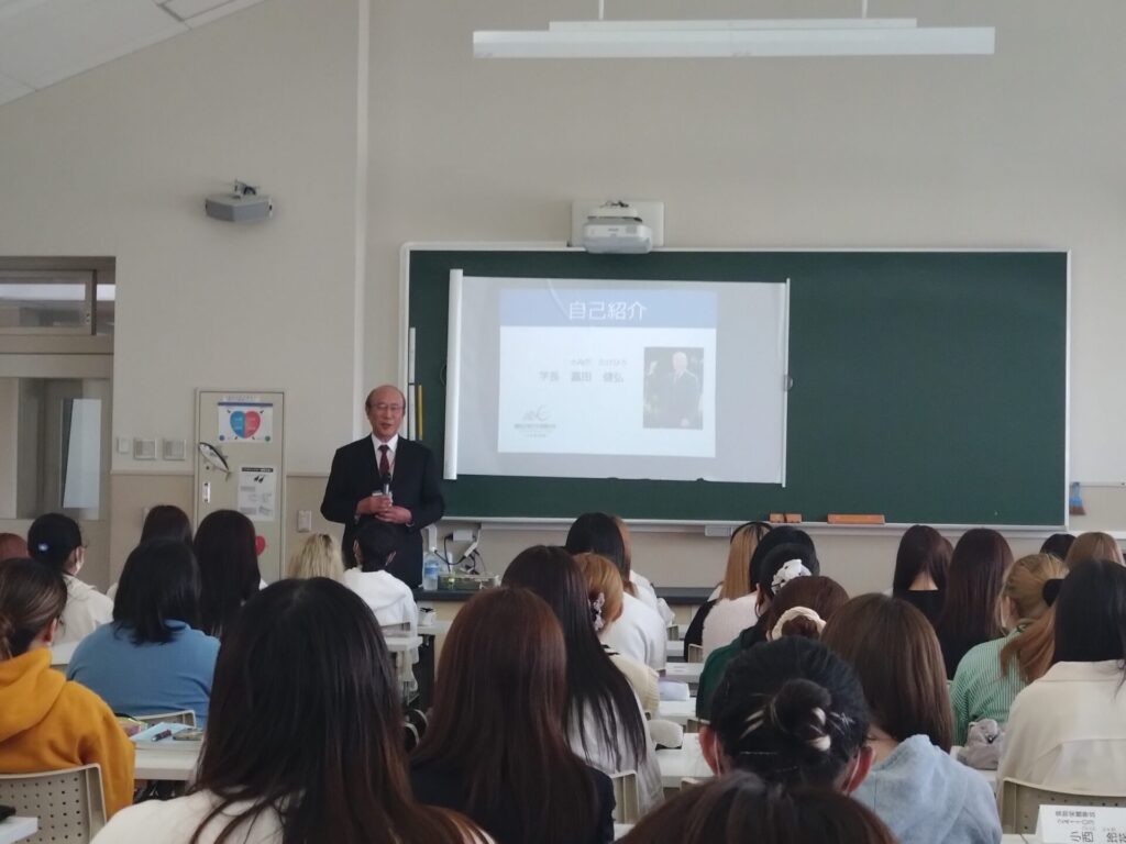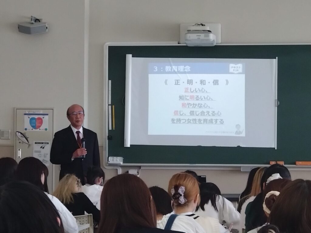 女性が社会で活躍することは、素晴らしく誇らしいことであること。また、誰に対しても親切に丁寧に接することが大切であると話してくださいました。学長に就任されるまでの経緯をユーモアを交えて話され、学生たちは、建学の精神に込められた意味や想いについて、熱心に耳を傾けていました。