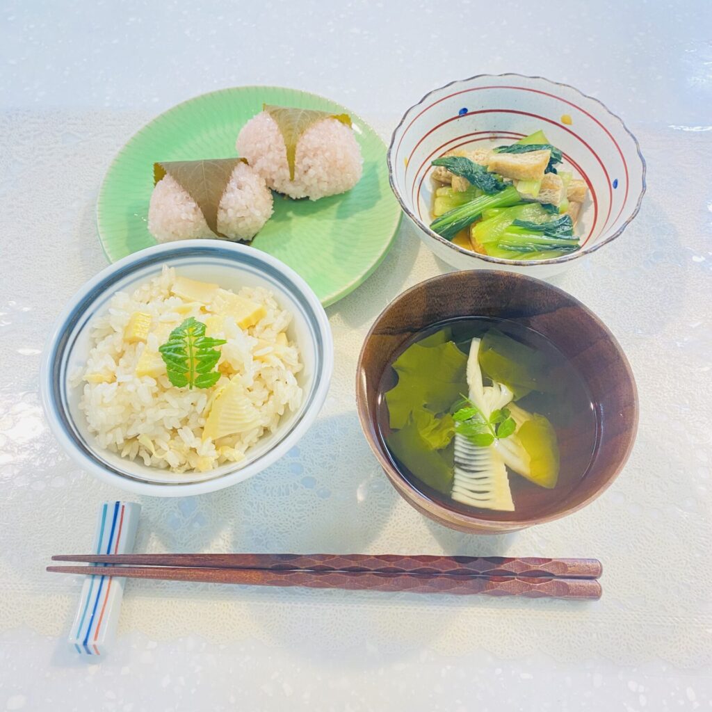 今日の献立は筍ご飯・若竹汁・小松菜と油揚げの煮びたし・桜餅です。