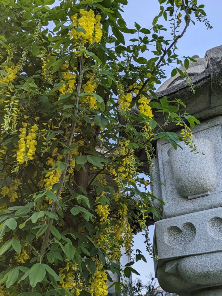 花房が藤と似ているので、キナバ藤とも呼ばれている「キングサリ」。珍しい藤なので見ると幸運になるとか。
