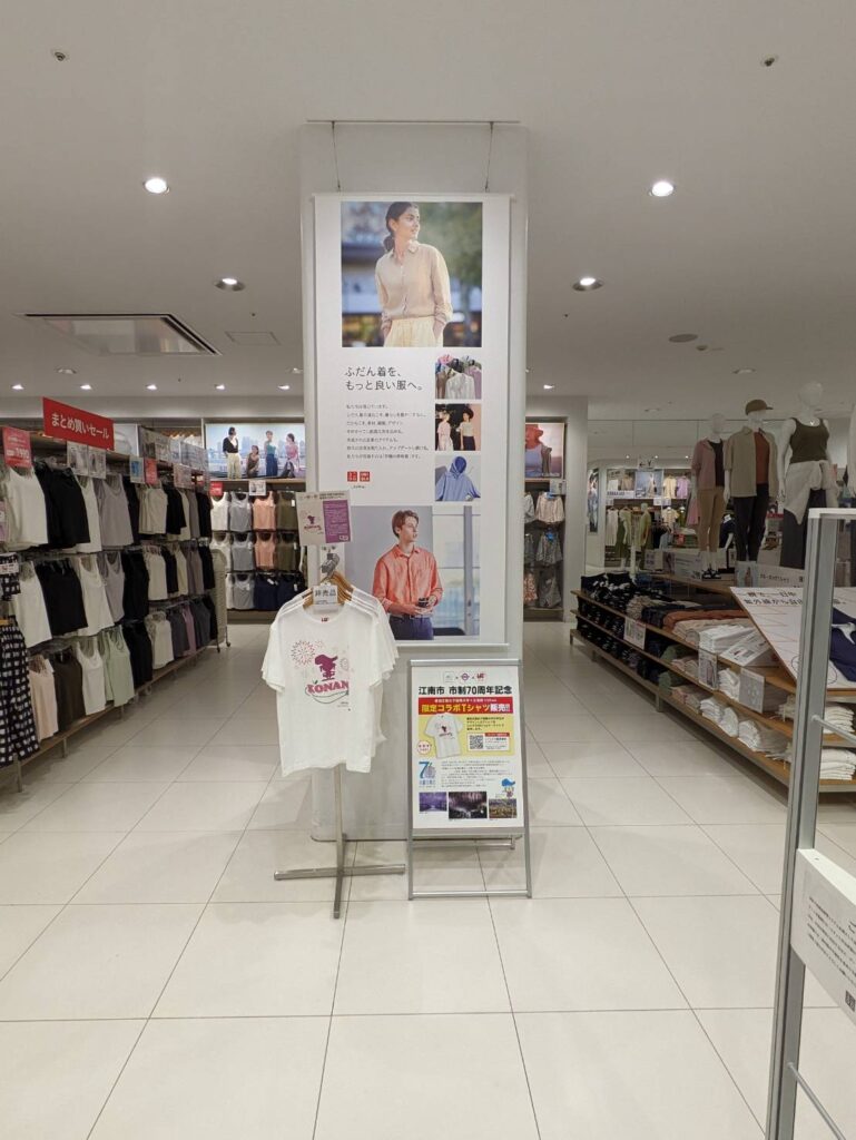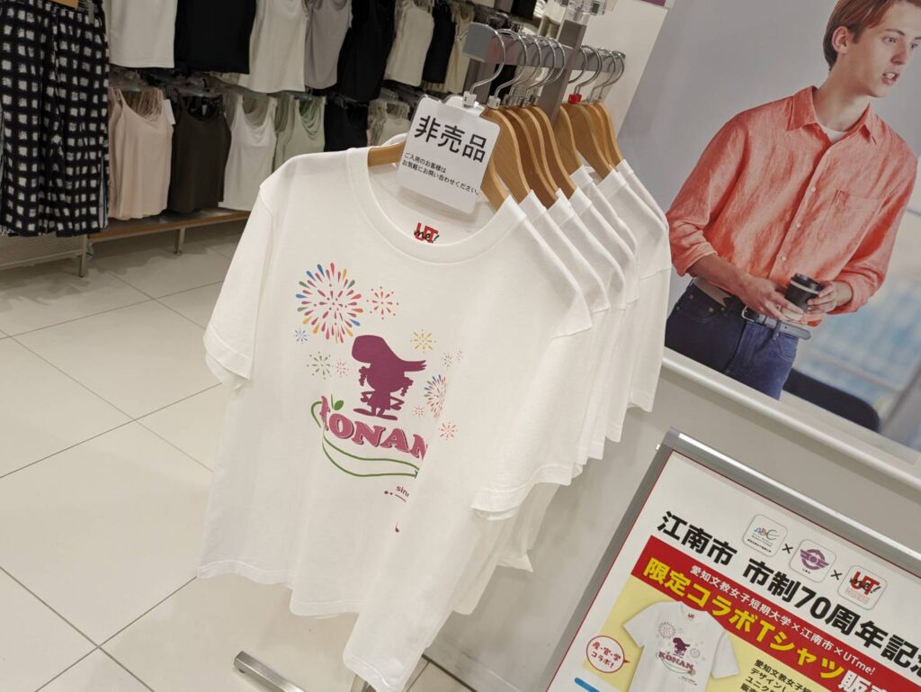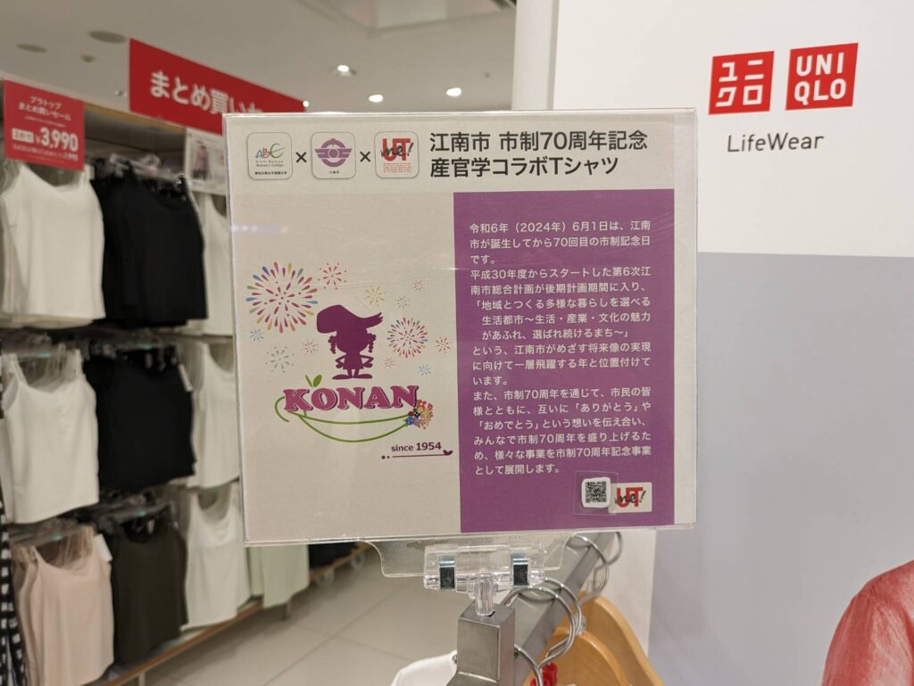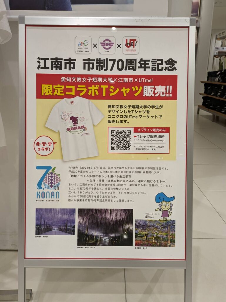 生活文化専攻の学生がデザインした、江南市制70周年記念Tシャツのユニクロ ヴィアモール江南店でのディスプレイが始まりました。