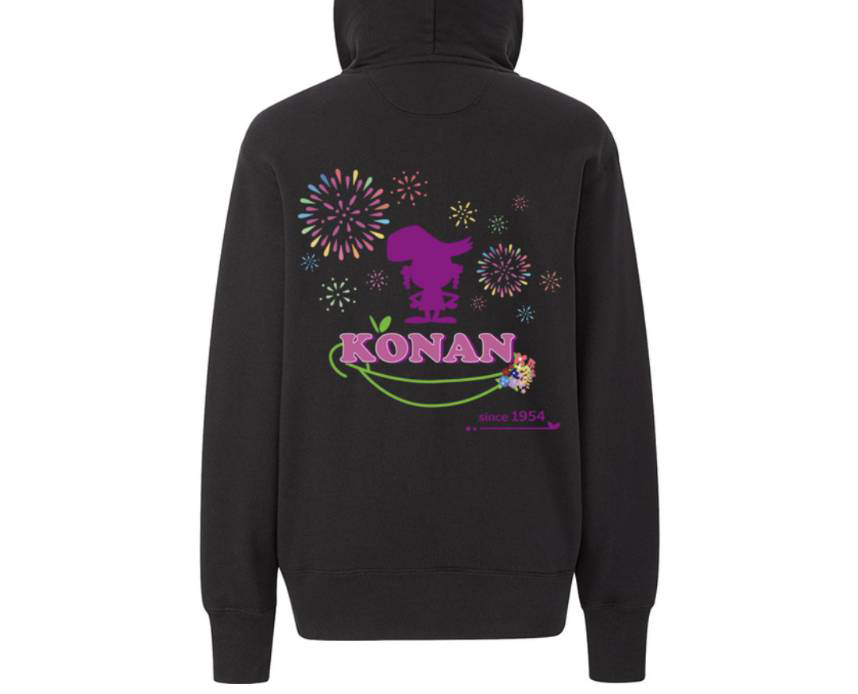 笑顔溢れる街にしたいという願いをこめ、KONAN の文字の下の茎を笑っている口元のようにし、笑顔と一緒に様々な花が咲く街を表現したTシャツが完成しました。江南市の有名な藤の花と江南市民花火大会の花火、江南市のマスコットキャラクターの藤花ちゃんがデザインされています。
