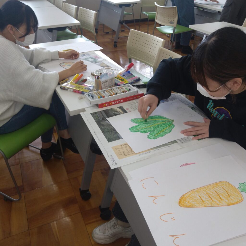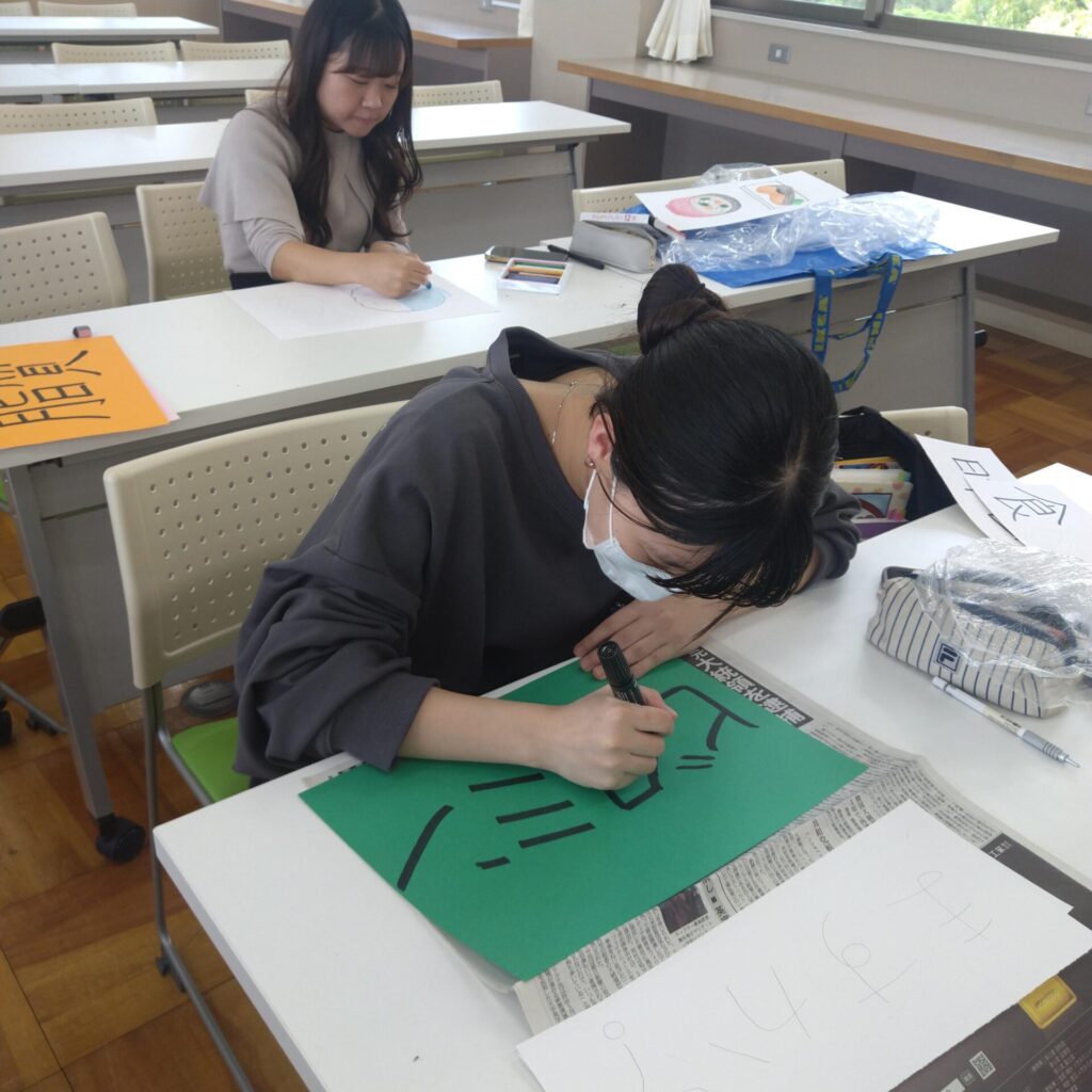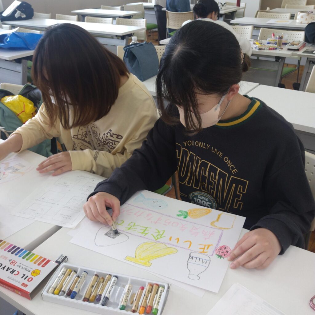 「栄養指導論実習Ⅱ」の授業では、それぞれの実習先の場面を想定し、テーマに合わせて栄養教育(食育)の指導案と教材を作っています。