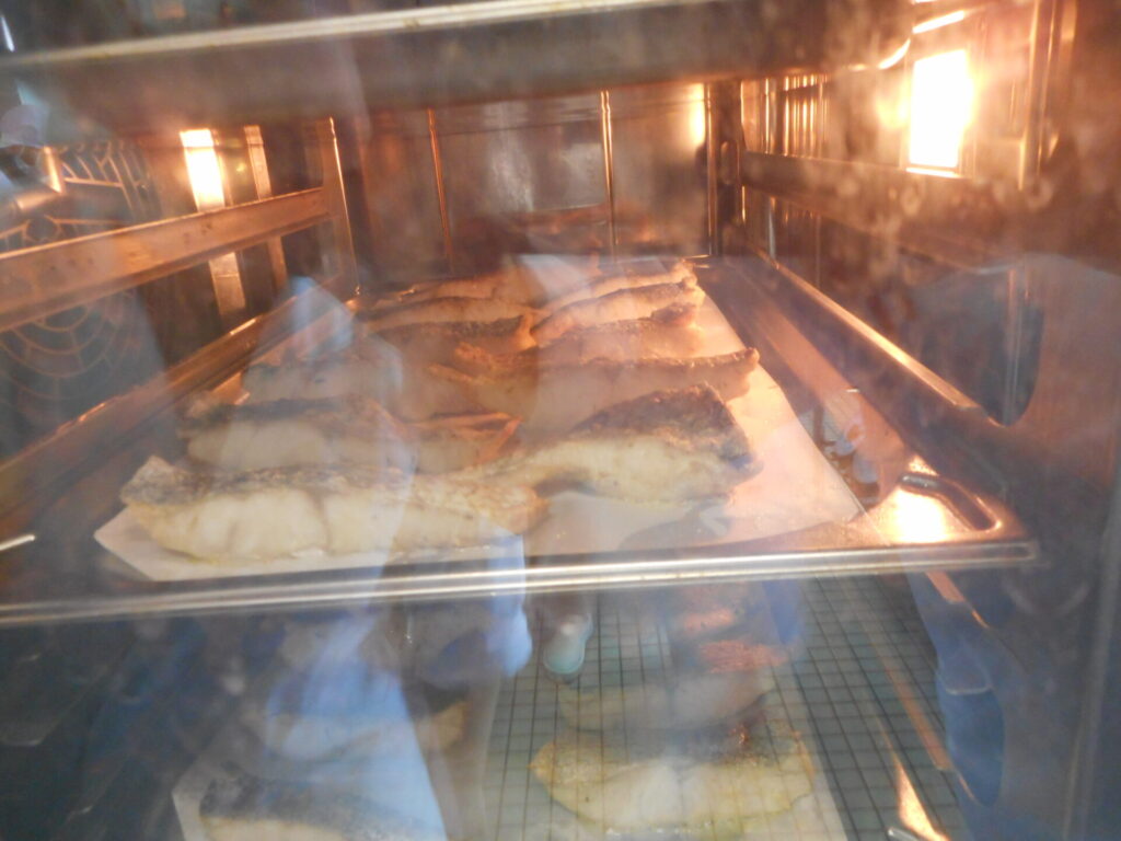 魚は、油で揚げずにスチームコンベクションで揚げ焼き風に仕上げ、脂質量を1/2に抑えヘルシーに調理しました。