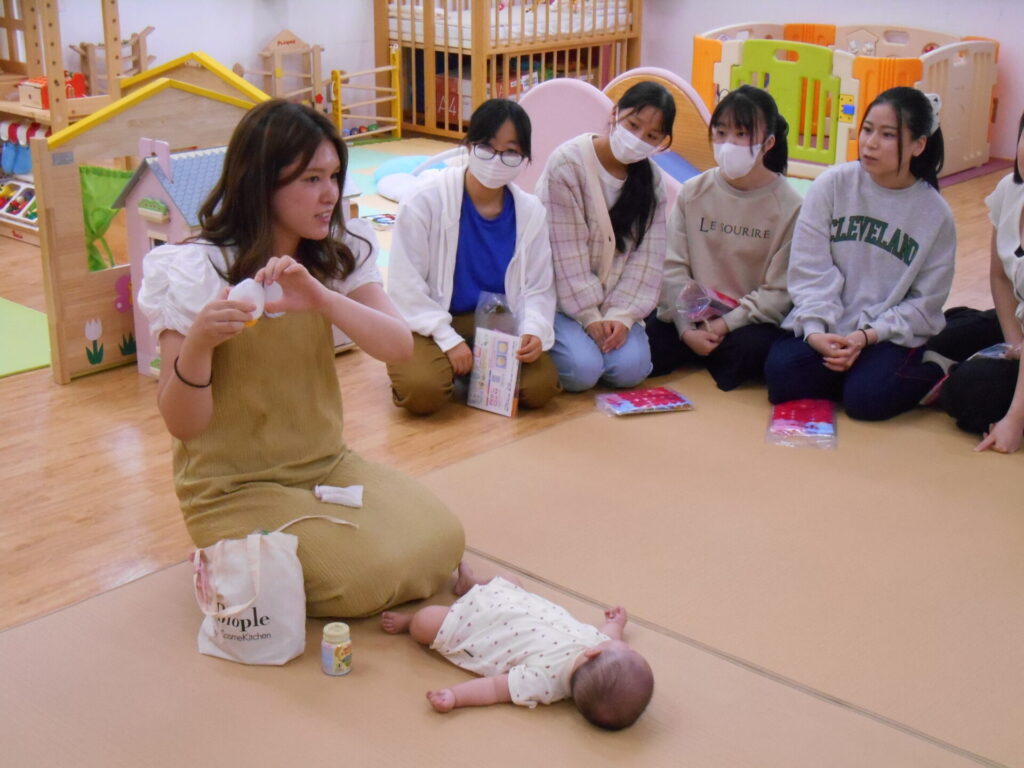 学内にある子育て支援施設「文教おやこ園」の調理台を使って授業を行い、おやこ園を利用されているお子さんの授乳の実際の様子も学ぶことができました。