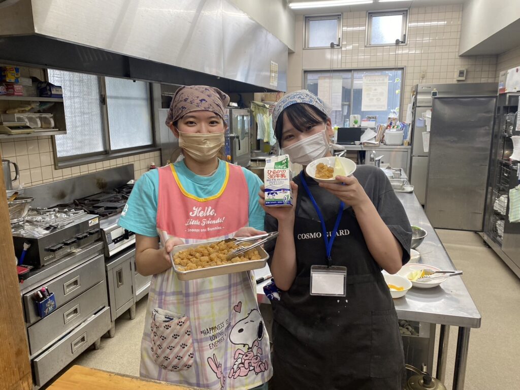栄養士校外実習の主な内容は給食の運営。給食室や厨房に入り、食事を作るだけでなく、施設の利用者に直接食事を提供することもあります。おやつを楽しみにした子どもたちが給食室まで来て、「おいしかった!」と空になった食器を受け取る時は、栄養士としてとても嬉しい瞬間。